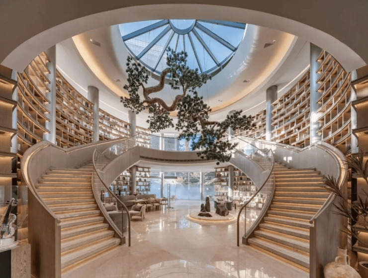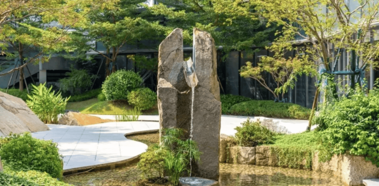 项目规划仅 165 户,打造约 4000 平艺术生活空间会所,专属服务业主,匹配顶级圈层需求。园林整体下沉约 5 米,借鉴枯山水造景理念,选用专人精挑细选的石材,搭配进口栽培、全冠移植的日本黑松、红枫等名贵树种,营造东方美学禅意园林。