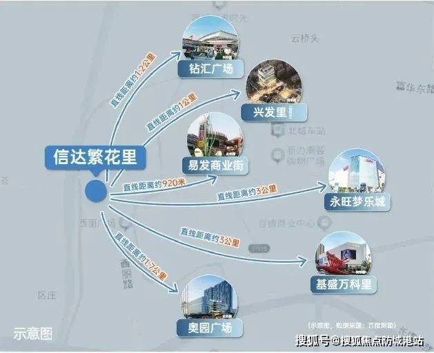商业:易发商业街(1.7km)、钻汇广场(2.3km)、奥园广场(2.8km);