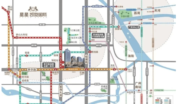星星凯旋国际位于季华路与南海大道交汇处,雄踞禅城与桂城之间,地理位置优越。项目紧邻地铁3号线镇安站和广佛线桂城站,并且规划中的4号线和6号线也将在此交汇,形成“十字轨道枢纽”。交通网络极为发达,出行十分便捷。从项目出发,约5分钟可速达环线,约10分钟直抵禅城中心与佛山新城,约15分钟畅达荔湾,约25分钟可达海珠。