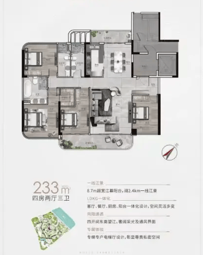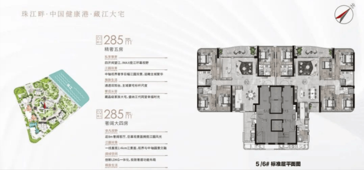 建面285㎡五房两厅三卫:东向一线望江,视野无遮挡,三江交汇的壮阔景致在家就能欣赏。独立玄关设计提升归家仪式感,阔绰客厅搭配全景落地窗,采光和景观都达到顶级水准,适合追求品质生活的高阶改善家庭。