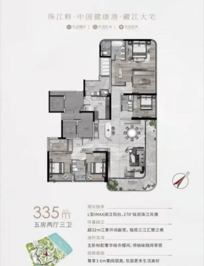 建面335㎡五房三厅三卫:作为大尺度改善户型,空间阔绰到离谱,收纳系统完善,能满足大家庭长期居住的多元需求。五房布局可灵活改造,不管是打造书房、影音室还是儿童游乐区,都能实现,堪称“终极改善范本”。