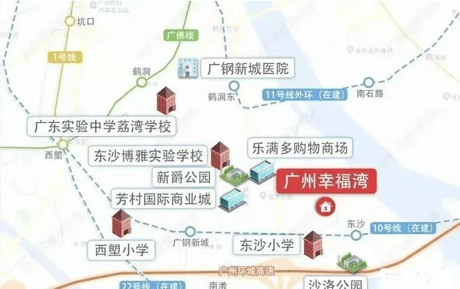 对于上班族来说,交通便利性直接决定生活幸福感,而广州幸福湾的交通网络,完美解决了“通勤难”的痛点。项目周边规划有地铁10号线东沙站、11号线鹤洞站、22号线东沙工业园站三地铁交汇,形成覆盖全城的轨道交通网络。