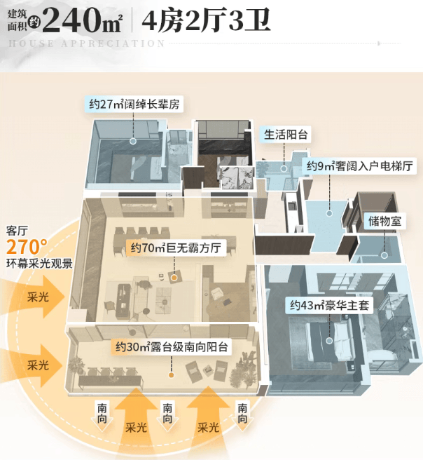其中,T7栋140㎡户型尤为惊艳:四开间朝南、双南向套房、约8.4米南向巨幕阳台、270°全景飘窗、约34㎡LDKG一体化宽厅……每一处细节都为提升生活质感而生。父母可享阳光主卧,孩子拥有独立成长空间,家庭聚会亦能从容应对,真正实现“三代同堂,各得其所”。