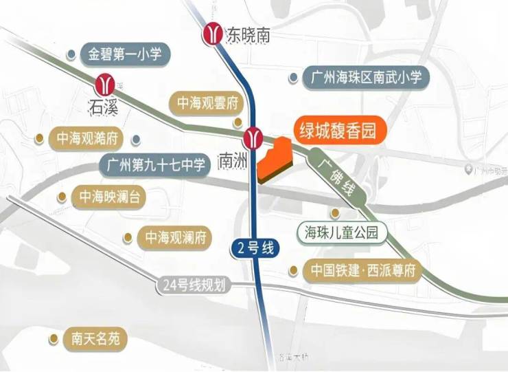 在现代都市生活中,轨道交通是衡量居住便利性的核心指标之一。绿城馥香园在交通规划上的最大亮点,莫过于其真正的“双地铁上盖”属性。项目距离地铁2号线与广佛线的交汇站——南洲站,直线距离仅约80至100米。这意味着业主从家中走出,仅需步行数分钟即可抵达地铁站口,真正实现了“出家门、进地铁”的无缝衔接。