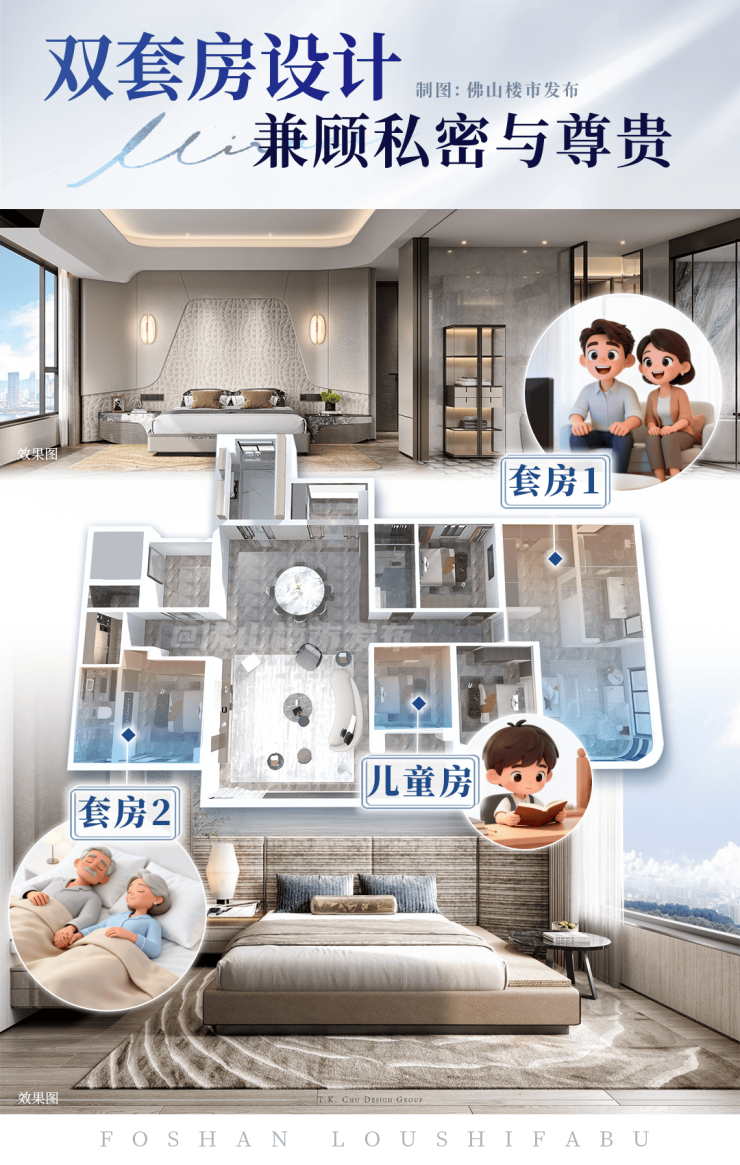 保利天瓒主打173-580㎡滨江奢阔大平层,涵盖改善四房、大家族五房、双子塔顶奢大平层多种产品,本次全新迭代升级的约248㎡江景新规五房与双子塔约300㎡定制户型,凭借创新空间逻辑与全维产品升级,成为广佛顶豪市场的核心竞争力作品,实用率接近100%,空间利用率与居住舒适度双向突破。