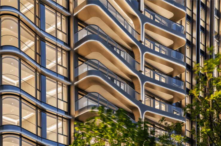 项目外立面融合曲面顶、曲面幕墙、铝板等多种材质,设计灵感源自“家族树”图腾,寓意家业传承。整栋建筑通过十几种工艺与色彩搭配,呈现出高级审美质感。该设计已荣获德国设计奖(被誉为“建筑界奥斯卡”)及亚太区IPA国际房地产大奖,成为广州豪宅美学新标杆。