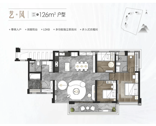 126㎡三房两厅两卫:改善入门首选,尊梯入户设计,阔幕阳台南向望白云山,LDKB 一体化空间提升家庭互动,独立家政间与步入式衣帽间增强实用性,适合三口之家;