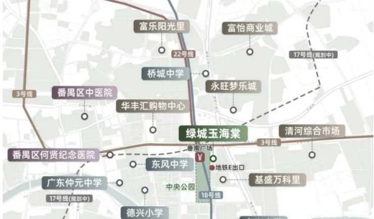 项目所在的番禺广场板块是区府核心区域,拥有番禺区唯一的传统中心地位,同时兼具城市新中心的活力。绿城玉海棠紧邻番禺中央公园和规划中的TOD枢纽,区域内未来规划包括高等级商业综合体、文化休闲设施以及完善的公共配套。周边土地资源稀缺,住宅供给有限,使得该项目成为区内珍贵的压轴臻品。随着番禺广场TOD建设及永隆综合体的推进,板块功能逐步完善,生活便利性及潜在增值空间显著提升。片区交通、商业及教育配套逐步落地,使得番禺广场板块未来升值潜力强劲,是长期投资及改善型家庭置业的优选区域。