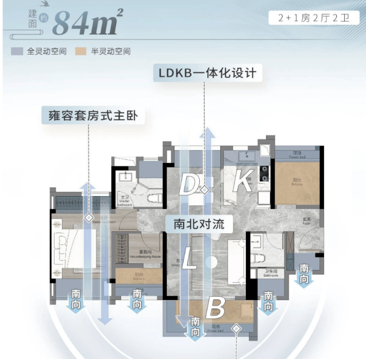 户型一:建面约 84㎡三房两厅两卫(使用率 100%)
