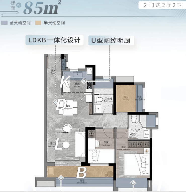 双卫设计,主卧套间带独立卫浴,私密性强