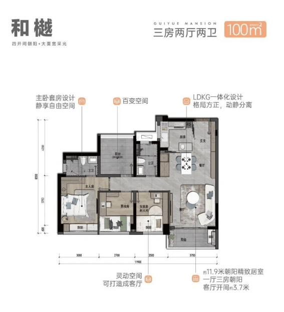 项目主力产品为建面约89㎡、100㎡、116㎡的三四房,全部采用当下流行的LDKG一体化设计(客厅Lounge + 餐厅Dining + 厨房Kitchen + 阳台Gallery),打破传统隔断,空间更通透,也更契合现代家庭互动需求。