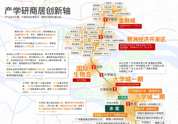项目位于大学城二期-国际创新城板块,这一区域占地面积达十平方公里,涵盖暨南大学、广州医学院等多所高等学府。国际创新城包括北翼的生物岛、核心的大学城以及南翼的南岸起步区等多个功能区。目前,大学城已经建成,而生物岛正在启动建设,南岸起步区的发展相对落后。未来,这里将规划建设大学智慧谷、产业孵化基地、化龙农业大观园等多个重点项目,形成一核两翼的空间结构。