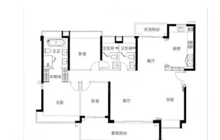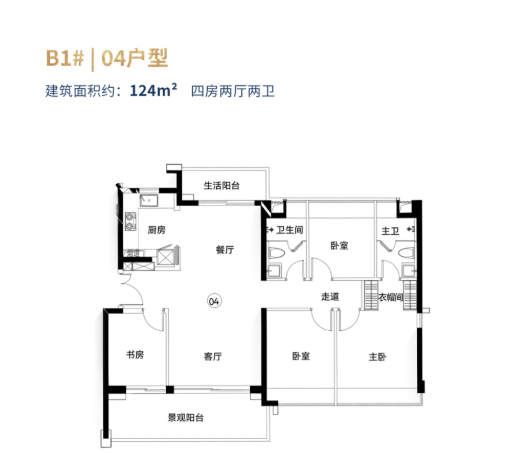 124㎡四房PLUS版:在121㎡基础上增设餐厅北侧生活阳台,并将景观阳台延伸至书房,储物与观景功能进一步升级。