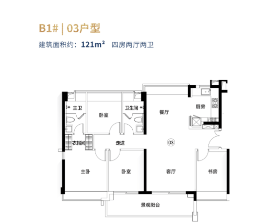 121㎡四房:方正格局、南北对流,四开间朝南,6.4米大阳台连通客厅,主卧带独立衣帽间与干湿分离卫浴,门口书房灵活改造为老人房,完美适配多代同堂。