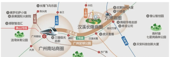 交通层面,项目打造亚太级 TOD 立体交通枢纽,尽揽 14 轨交汇的交通优势:距离地铁 7 号线谢村站仅约 300 米,步行 5 分钟可达,2 站直达广州南站、3 站直达万博 CBD;自驾 5 分钟直达广州南站,依托南站的高铁、城际、地铁、公交多维交通网络,1 小时覆盖大湾区所有核心城市,3 小时通达全国主要城市。同时,汉溪大道(建设中)串联广州南站、长隆、万博三大核心板块,形成 “轨道 + 快速路” 的双维交通体系,无论是日常通勤、跨城出行还是商务往来,均能实现极速通达,执掌湾区交通动脉。