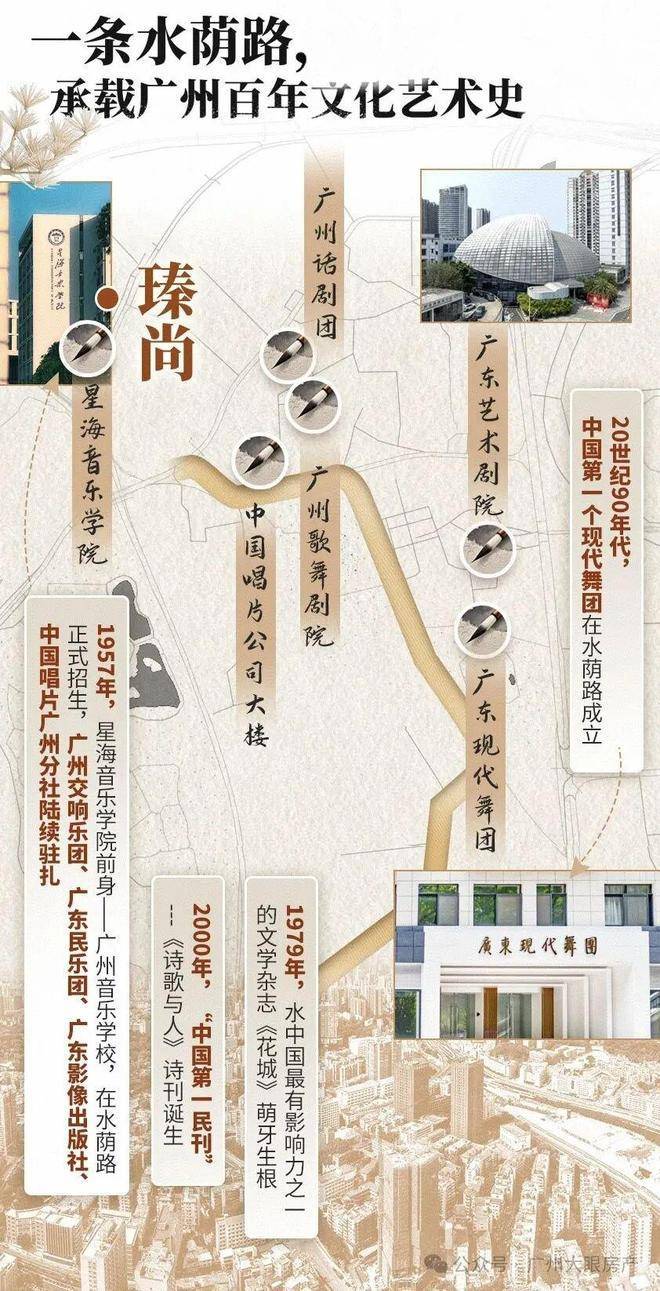 走进项目,你会先被它的文化氛围打动。南侧的水荫路,从上世纪70年代起就成了广州文艺青年的聚集地。《花城》杂志、《诗歌与人》这些在全国都有影响力的刊物,都在这里诞生。中国第一个现代舞团也从这条街起步。如今短短一公里范围内,广州歌舞剧院、广州话剧团、星海音乐学院、中国唱片公司大楼等机构云集,上百位艺术家在这里生活工作。全国少儿舞蹈展演的广东选拔赛,很多都从水荫路起步。这片区域承载着广州人追求自由、热血和梦想的精神气质,百年文脉从未断过,反而越来越有活力。