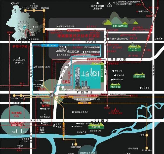 强区位占位广深科创走廊的核心—广州东TOD国际新城之上,位于三大核交汇处