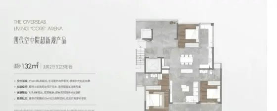 132㎡三房两卫:配置约20㎡空中庭院与7.8米南向阳台,主卧带独立卫浴,功能分区清晰,适合三口之家或首次改善家庭。