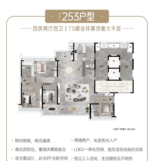 建面约253㎡定奢五房:同样位于中轴园林上,属于环幕景观楼王产品,限量级供应。专梯专户设计,私属电梯门厅,保障业主的居住私密性与尊崇感。四开间朝南,南北对流阳光满格,室内空间宽敞明亮。双阳台设计,约10.3米宽巨幕阳台,景观视野极致开阔。双主卧套房设计,满足多代人居住的私密需求,总统级主卧奢套配备步入式衣帽间、双洗手台、浴缸,全方位提升居住舒适度与奢华感。