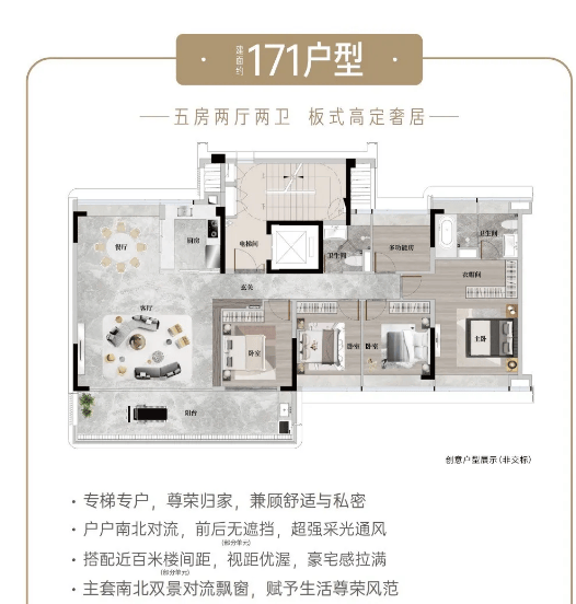 建面约171㎡奢适五房:该户型为低密8F小高层产品,仅少数人拥有,稀缺性极高。采用专梯入户设计,尊享私密空间,提升业主的居住尊崇感。五房设计能够充分满足三代同堂的居住需求,让每个家庭成员都能拥有独立的生活空间,其乐融融。同时,户型享长隆头排景观,站在阳台就能欣赏到长隆野生动物世界的美景。
