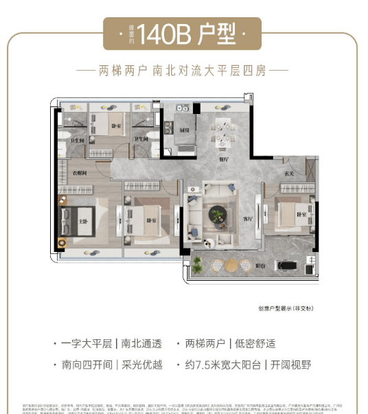 建面约140a㎡高定四房:该户型拥有少有高层景观,视野更开阔,让业主能够尽情欣赏周边美景。采用板式布局,南北对流,阳光满格,室内光线充足、空气流通。全屋精装交付,按照酒店式星级居所标准打造,为业主提供高品质的居住体验,性价比至高。