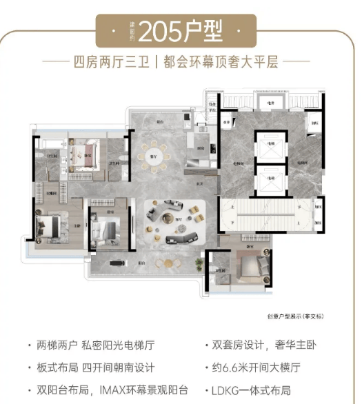 建面约205㎡奢适四房:作为中轴园林上的环幕景观楼王,该户型为限量级CBD低密板式高层产品。专梯专户设计,私属电梯门厅,尽显私密尊崇。四开间朝南,南北对流阳光满格,室内采光通风效果极佳。双阳台设计,近9米宽巨幕阳台,打造极致的景观视野,将中轴园林美景尽收眼底。双主卧套房设计,让孩子多一度独立空间,总统级主卧奢套配备步入式衣帽间、浴缸,为业主提供奢华的居住体验。