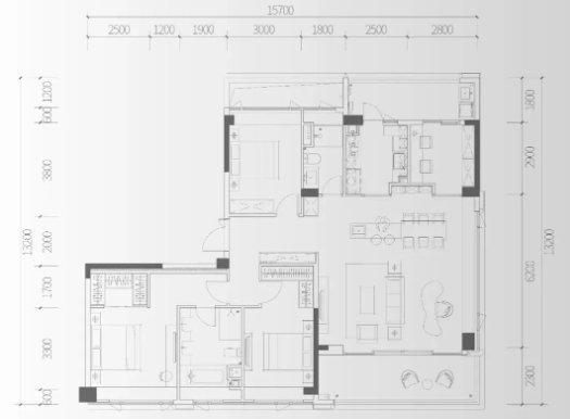 D2户型建面约174㎡,四房两厅两卫,同样采用一梯一户与纯板式设计,南北对流。该户型最大亮点是270°约6.6m+8.5m环幕IMAX景观面,全方位捕捉景观与采光,视野极为开阔;独立主套与多功能客厅设计,进一步提升了居住的舒适度与空间灵活性,适合追求高品质生活的改善型家庭。