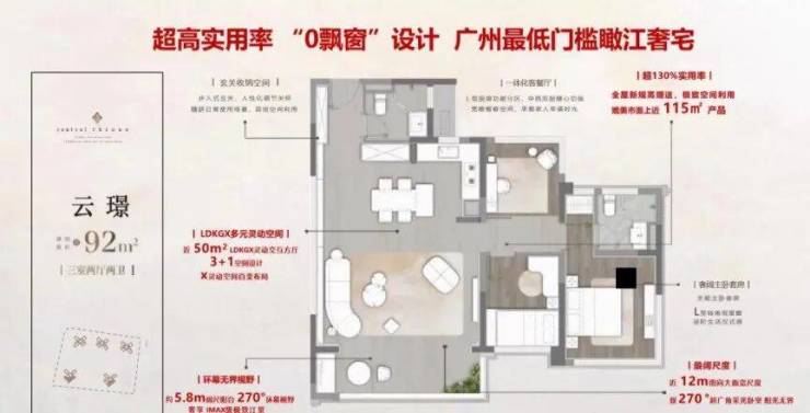 95㎡三房:11.8米南向面宽,5.8米超大阳台,LDK一体化面积约39㎡,主卧配270°环幕观景窗,部分布局支持灵活改造为三四房;