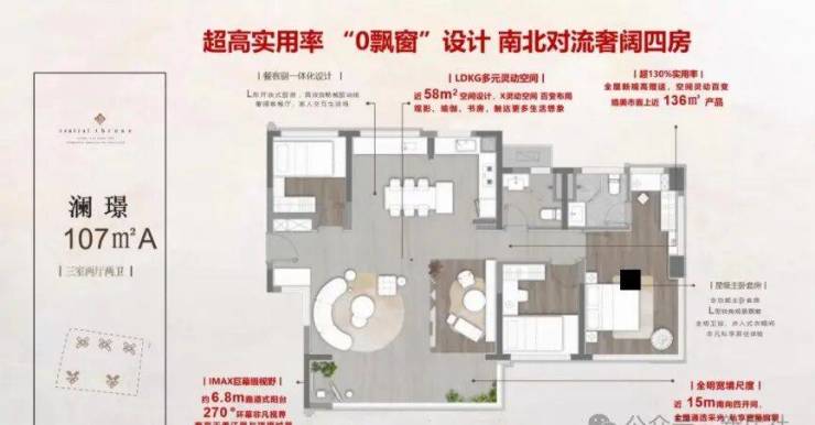 107㎡四房:14.5米南向面宽,6.8米阳台,首创“阳光女神衣厅”,LDK约38㎡,主卧带独立衣帽功能;