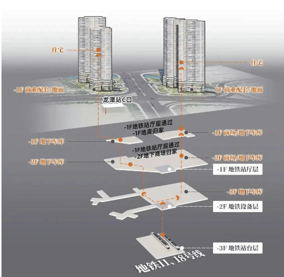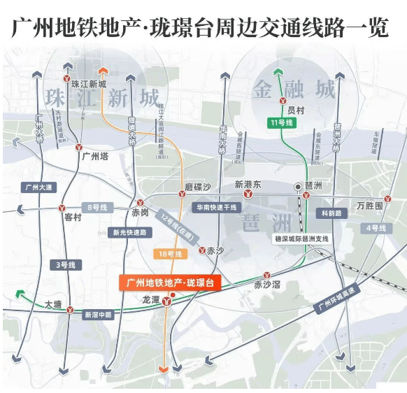 珑璟台是名副其实的“双地铁上盖”TOD项目,楼下即为18号线与11号线交汇的龙潭站,堪称广州轨道交通的“黄金十字路口”。18号线作为“湾区之王”,时速高达160公里,30分钟内直达中山、珠海,未来还将延伸至深圳;11号线则是广州首条大环线,串联珠江新城、白鹅潭、万博、广州东站等城市核心枢纽,形成“黄金闭环”。项目通过架空连廊实现“地铁入户”,四层商业裙楼之上即为住宅入口,归家动线全程风雨无阻。更关键的是,随着红卫村旧改推进,未来小区东侧市政路打通后,步行10分钟即可直抵琶洲会展中心核心区。对于高频商务人士或跨城通勤族而言,珑璟台提供的不仅是速度,更是效率革命。