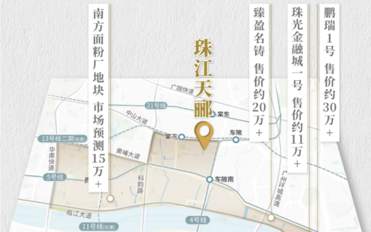 项目交通体系完善,未来可汇聚五条地铁线路,包括棠东站、车陂南站及社区连廊直通车陂站和棠下站,打造立体交通网络,方便居民通达“金珠琶”核心圈。车陂南隧道开通后,从项目出发前往琶洲CBD无需绕行,过江时间大幅缩短。沿中山大道、黄埔大道、科韵路等干线自驾亦便捷,轻松直达珠江新城、体育西等核心商圈。2024年建成的金融城综合交通枢纽将进一步提升出行效率,实现多轨交汇、一站通达全城,极大提高通勤便利性与生活效率。