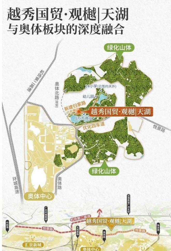 观樾 | 天湖虽距离最近的地铁大观南路站约 2km,但交通便利性正逐步提升。目前,周边居民主要通过悦景路出行,东接珠吉路,西连奥体路,进而连接广园快速、大观南路等主干道,上下高速便捷。悦景路作为牛奶厂整个片区的唯一主干道,其改造工程将为越秀・观樾及缦云广州等新盘业主带来便利。此外,世界大观将新建一条道路直接接驳奥体路与机场二高速,板块交通短板即将补齐,居民出行将更加顺畅。