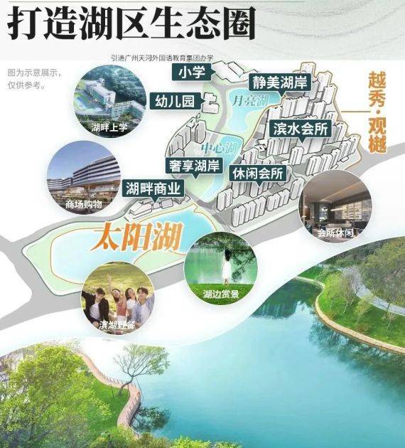 休闲配套:出门即享约 243 万方山湖林海,仅 1.98 容积率,14.9 万方公园绿地、5.3 万方日月双湖与 1.9 公里湖岸线环绕。三面环山,私享面积最大、湖面最开阔的太阳湖,可瞰湖、游湖、泛舟,享受诗意浪漫的休闲时光。