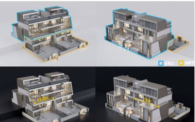 此次推出的合墅产品分为合墅(上)与合墅(下),独具匠心。与传统合墅不同,它避免了中叠的尴尬,保证更低密居住体验,让所有住户都能满足 “有天” 或 “有地” 的纯粹墅居感受。合墅(下)南入户,合墅(上)错层北入户,回家动线错开,私密性更高。各自拥有独立空间,系统完整,且采用游艇立面,颜值质感在线。