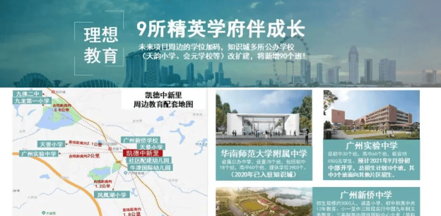中新知识城内设有丰富的教育资源,包括学前教育机构、小学15所、初中2所、中学6所,以及广东省农工商职业技术学院(北校区)、华师大康大学院、广州商学院、新加坡南洋理工学院等高等教育机构。此外,华师附中(初中、高中)也落子于此,未来将形成从幼儿园到大学的完整教育服务体系。项目自带公办幼儿园,方便居民子女就学。