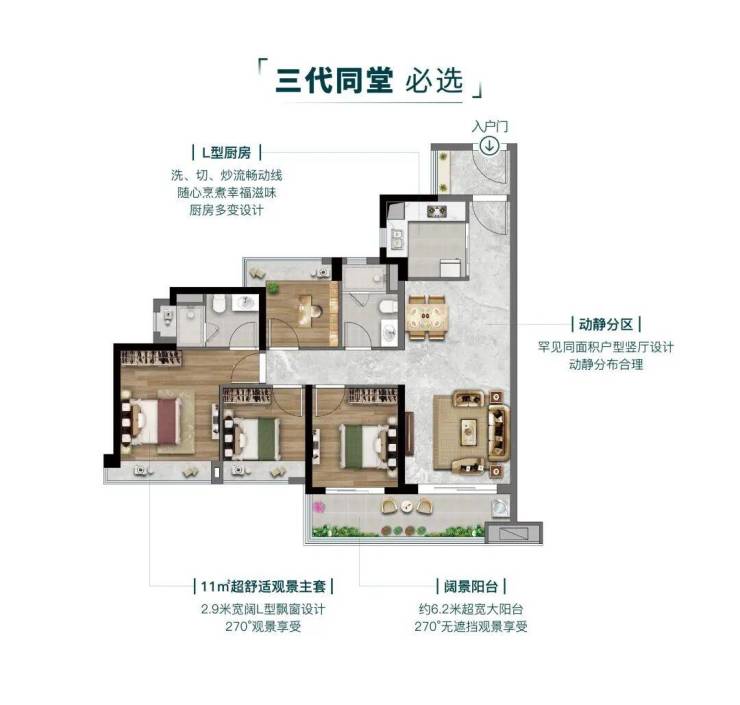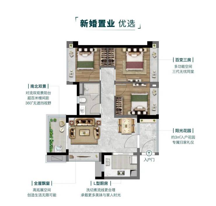 超百米观景视野,舒享静谧居住体验,新式蝶式布局,户户入户花园设计,对流通风无遮挡,尽享360°环幕视野