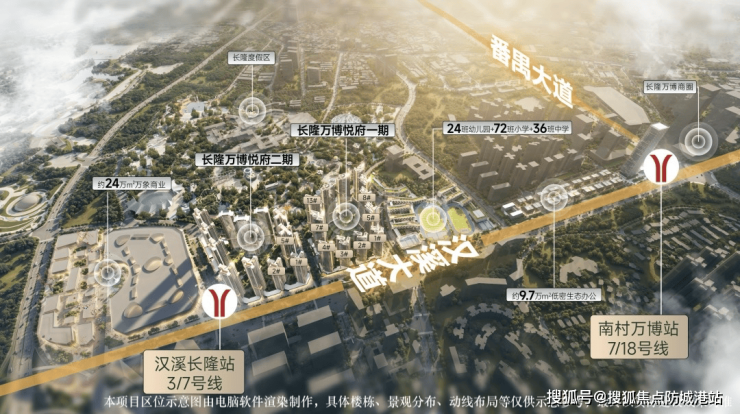 交通枢纽: 地铁7号线南村万博站(实测530米)、3号线汉溪长隆站(665米),18号线快线3站直达琶洲、4站到珠江新城。