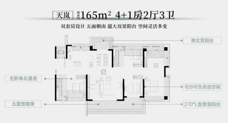 165㎡4+1房大平层,堪称终极改善之选。南向面宽17.4米,近9米L型景观阳台可俯瞰山景,视野无敌。双主套设计保障了家庭成员的私密性,适合多代同堂家庭居住。中式厨房搭配独立西式岛台,满足了多元烹饪需求,无论是家庭聚餐还是朋友派对,都能轻松应对。