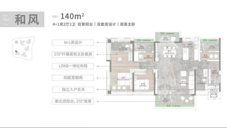 140㎡4+1房户型,舒适度进一步提升。南向采光面达15.7米,阳光能充分洒满房间的每一个角落。南北双阳台设计,不仅增加了采光通风效果,还实现了“观景+生活”的功能分区。主卧配备270度折叠屏飘窗,躺在床上就能欣赏到窗外的美景,私密性和舒适度都拉满。