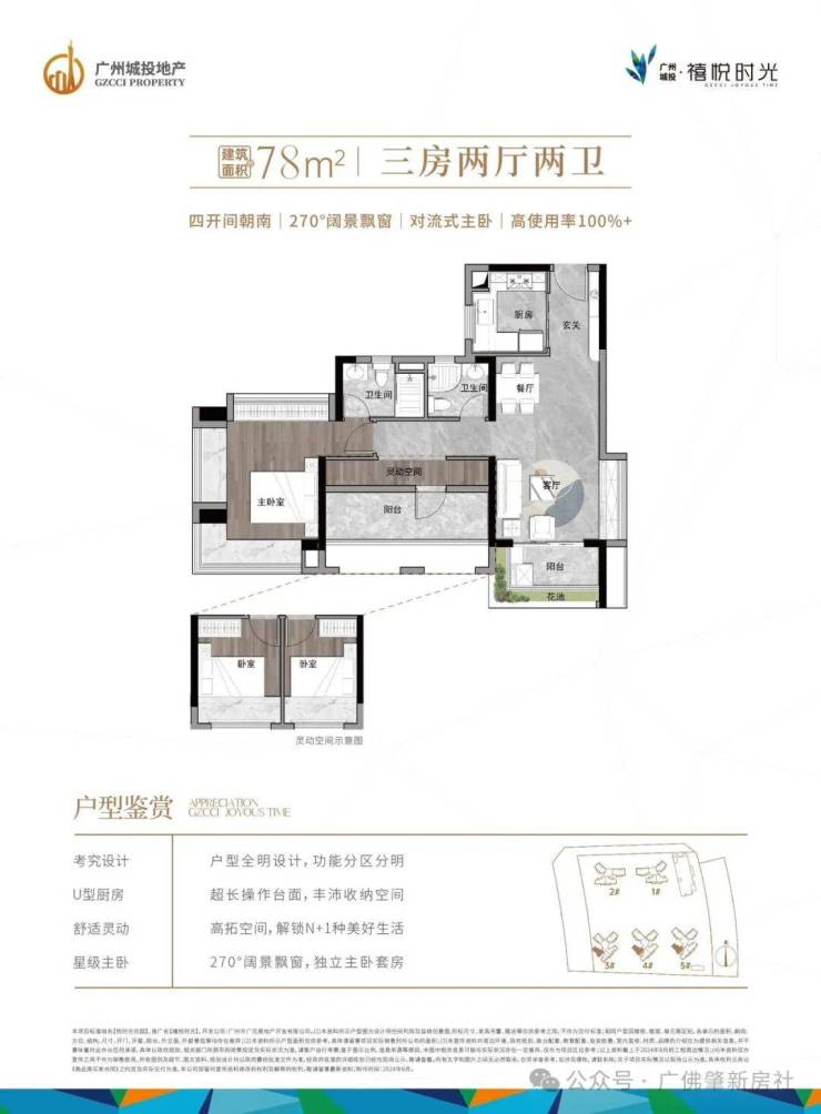 项目产品规划极具竞争力,涵盖约 78-118 平方米精装三至四房,高使用率户型,满足不同客户的居住需求。项目采用围合式布局、全南向蝶形楼栋设计,户户朝南、三面纳阳、视野无遮,确保每一户都能享受充足的采光与通风,提升居住舒适度。梯户比为两梯四户 / 两梯五户,人均电梯使用效率高,有效减少业主等待电梯的时间,提升出行便捷性。住宅楼层为 23-26 层,建筑高度适中,既保证了居住的舒适性,又提供了良好的视野,北眺花都湖国家湿地公园,南望广花新城城市景观。