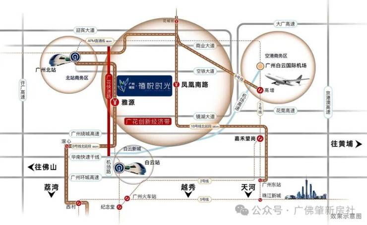 项目坐拥 “轨道 + 快速路 + 高速” 多维立体交通网络,畅通广州主城区,实现白云、花都、天河等区域的快速通达。轨道交通方面,项目为地铁 8 号线北延段(在建)雅源站上盖,出门即地铁口,步行距离仅约 50 米,是真正意义上的地铁上盖项目。地铁 8 号线北延段预计 2026 年通车,通车后 2 站瞬达白云、3 站到广州北站,未来可接驳 18 号线北延段(在建)凤凰南路站,5 站直达天河核心区,高效通行,擎领城市的从容自由。