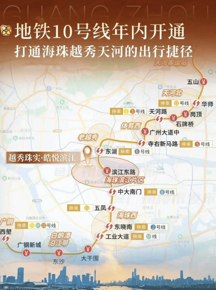 答:当前出行:自驾极为便利,通过滨江中路、江湾大桥、海印桥可快速通达越秀、天河。公共交通方面,距离现有地铁2号线市二宫站约1.2公里,可通过公交、骑行等方式接驳。未来利好:根据广州地铁官方规划,在建的10号线(东湖-西塱)设有“滨江东站”,位于项目东侧约800米处(数据来源于高德地图测距)。该线路预计将于未来几年内建成通车,届时将极大提升项目轨道交通出行的便捷性,一线直达天河、越秀核心区。