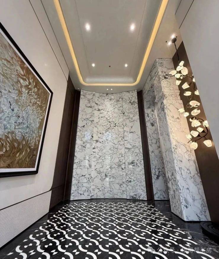 公区材质全球甄选,大量采用与保利高端项目同款的名贵石材,例如地面、墙面使用的潘多拉奢石、卡拉拉白大理石等,纹理自然、质感温润,与保利天曜、玥玺湾样板房所用石材几乎一致。石材切割、拼接工艺采用 “无缝拼接” 技术,误差控制在 0.5 毫米以内,边角打磨圆润,细节处彰显央企精工品质。