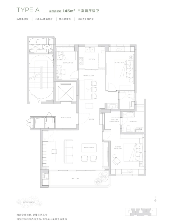 作为项目的入门级产品,145平方米户型依然保持了极高的水准。该户型独享私家电梯厅,面积约7.2平方米的森幕宽厅让人眼前一亮。LDKB(客厅、餐厅、厨房、阳台)一体化设计,打破了传统空间的界限,使得公共区域显得异常宽敞明亮。全明户型设计,确保每个房间都有自然采光。虽然面积相对紧凑,但三房的设计足以满足年轻夫妇或三口之家的需求,且预留了充足的改造空间,可根据家庭成长进行灵活调整。