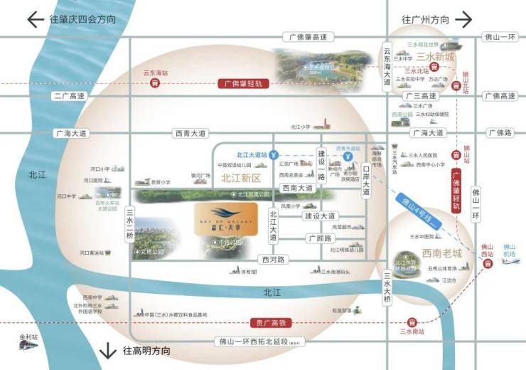 项目距佛山地铁4号线北江大道站(始发站)步行距离适中,该线路建成后将高效串联佛山中心城区与广州南站方向。同时,广佛肇城际轻轨的三水北站、云东海站约15分钟车程可达,从三水北站出发: