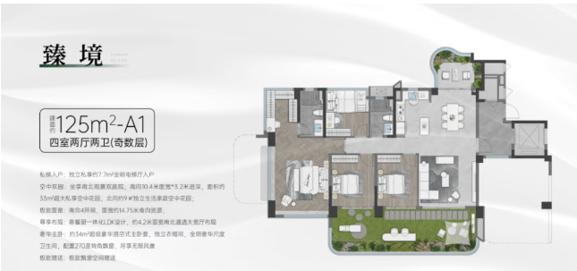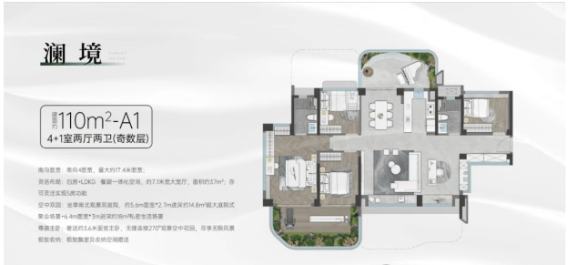 招商林屿境推出的110㎡王牌户型,赠送面积高达46㎡,相当于购买110平方米却能享有接近170平方米的空间,实现了四房功能。该户型的使用率超过140%,远超常规新规项目,性价比非常突出。此外,露台与阳台相结合,打造出了“空中庭院”,使户内与自然无界融合。