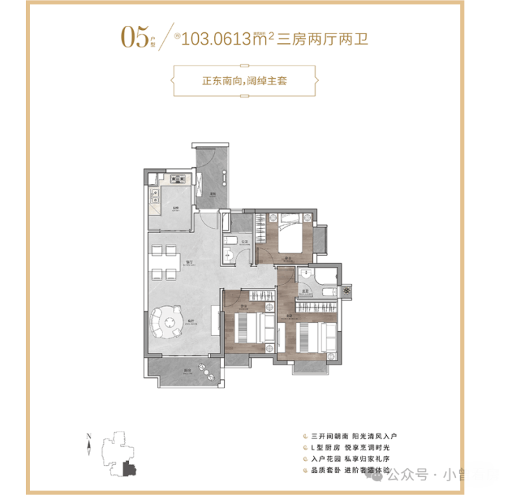 约103㎡三室两厅:总价336万-450万元。作为社区的进阶之选,拥有更宽阔的客厅面宽和更为开阔的景观阳台,部分高楼层单元可眺望都市远景。房间尺度更为宽松,特别适合需要老人同住、追求更宽敞居住体验的多人口家庭。