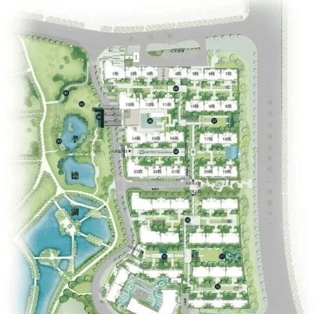 以自然无界为设计理念,将 353 亩孝德湖与社区有机结合,引湖入园,塑造园中院落。通过传统岭南造园布景手法结合现代美学,打造两轴双园十二景,外环美湖,内藏雅园,让业主仿佛置身于诗意画卷之中。