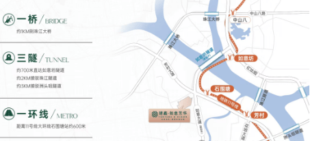 建鑫·如意芳华距离地铁11号线石围塘站约600米,步行8-15分钟即可到达。11号线是广州首个大环线,途径多个中心区,换乘站多达14个,出行极为便利。自驾方面,项目紧邻芳村大道,可通过洲头咀隧道、内环路等快速通达天河、越秀等核心区域。