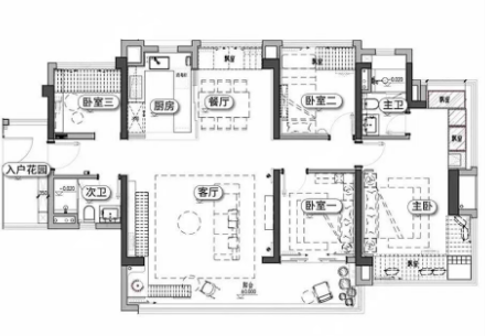 约125平方米四房:拥有8.3米长的阳台,进一步提升了居住品质。